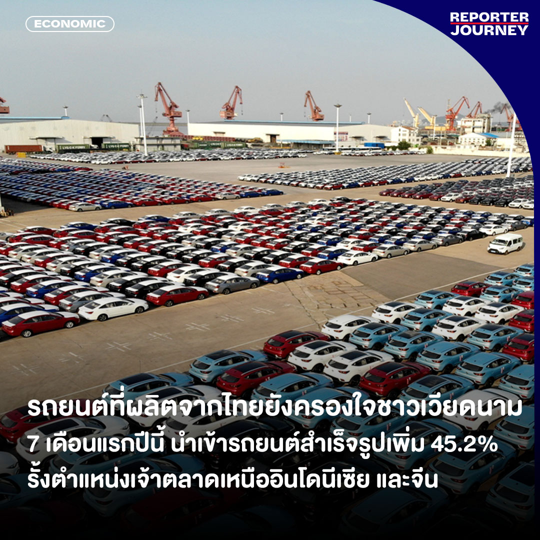 โดนรถยนต์จากประเทศไทยที่เวียดนามนำเข้ามีจํานวน 36,087 คัน เพิ่มขึ้น 45.2% คิดเป็นมูลค่า 762.2 ล้านดอลลาร์ ขณะที่เดือนกรกฎาคมเพียงอย่างเดียวรถยนต์ที่นําเข้าจากประเทศไทยสูงถึง 3,714 คันหรือเทียบเท่ากับมูลค่าการซื้อขาย 84 ล้านดอลลาร์