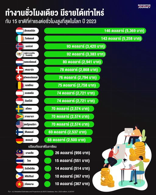 เทียบชัดๆ ปี 2023 ใน 1 ชั่วโมง คุณภาพแรงงานแต่ละประเทศ สร้างมูลค่าทางเศรษฐกิจได้เท่าไหร่ โดย องค์การแรงงานระหว่างประเทศ สหประชาชาติ