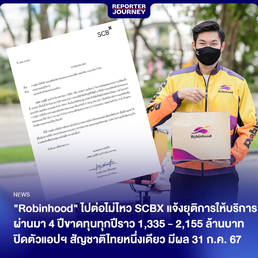 บริษัท เอสซีบี เอกซ์ จำกัด (มหาชน) แจ้งยุติการให้บริการแอปพลิเคชัน Robinhood ของบริษัท เพอร์เพิล เวนเจอร์ส จำกัด ซึ่งเป็นบริษัทภายใต้กลุ่มเอสซีบี เอกซ์ มีผลตั้งแต่วันที่ 31 ก.ค. 2567 เวลา 20.00 น. เป็นต้นไป หลังจากบรรลุภารกิจช่วยเหลือร้านค้า ไรเดอร์ และคนตัวเล็กในช่วงวิกฤตโควิดได้ตามเป้าประสงค์ที่ตั้งไว้