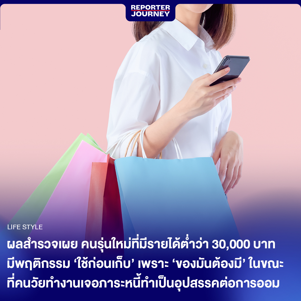 “ผลสำรวจเผย คนรุ่นใหม่ที่มีรายได้ต่ำว่า 30,000 บาท มีพฤติกรรม ‘ใช้ก่อนเก็บ’ มากกว่าคนรุ่นอื่น ๆ ซึ่งส่วนหนึ่งเป็นเพราะ ‘ของมันต้องมี’ หรือก็คือต้องตามกระแสสังคม ในขณะที่คนวัยทำงานเจอภาระหนี้เป็นอุปสรรคหลักต่อการออมเงิน ทำไม่มีเงินเก็บ-เก็บเท่าที่มี”