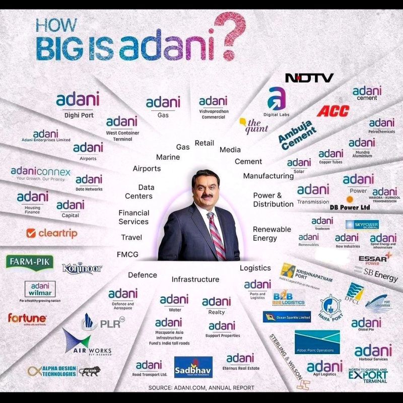 สำหรับ Adani Group เป็นกลุ่มบริษัทข้ามชาติของอินเดียที่ใหญ่ที่สุด และเป็นที่รู้จักทั่วโลก มีธุรกิจหลากหลาย ครอบคลุมอุตสาหกรรมหลักทั้งพลังงาน โครงสร้างพื้นฐาน เหมืองแร่ โลจิสติกส์ น้ำมันและก๊าซ อาหารและเกษตร เทคโนโลยีดิจิทัล การเงินและประกัน มูลค่าตลาดรวม (market capitalization) ของบริษัทในเครือจดทะเบียนในตลาดหลักทรัพย์อยู่ในระดับกว่า 200,000 – 250,000 ล้านดอลลาร์สหรัฐ ทำให้ กัวตัม อดานี เคยขึ้นเป็นบุคคลที่ร่ำรวยที่สุดในเอเชีย และติดอันดับต้น ๆ ของโลกในช่วงไม่กี่ปีที่ผ่านมา